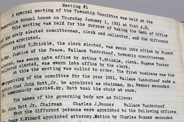Ninety years ago, the Township Committee held its annual special meeting, now called reorganization meeting, in the Powerville Schoolhouse on January 1, 1931 at 9:40 AM for the purpose of administering the Oath of Office to the newly elected Township Committee member, township clerk, tax collector and appointed officers. Also the Chairman, also known as the Mayor, was selected from the Township Committee members - at that time, there were three members of the Township Committee