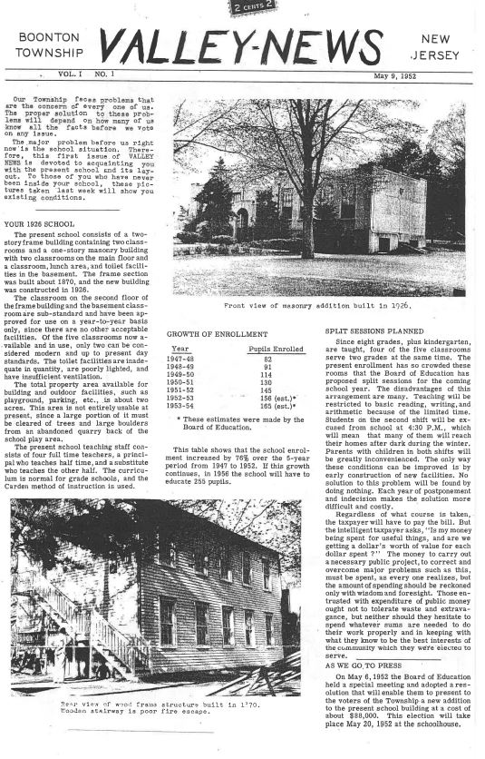 The May 9, 1952 edition of the Township Newsletter, Valley News was devoted to the overcrowding at the Powerville School and detailed the plans for the school addition. The 1870 and the 1926 schoolhouses on the site were overcrowded requiring the Township to construct a three classroom addition. The referendum took place on May 20, 1952 which passed as the addition was constructed at a cost of $88,000.